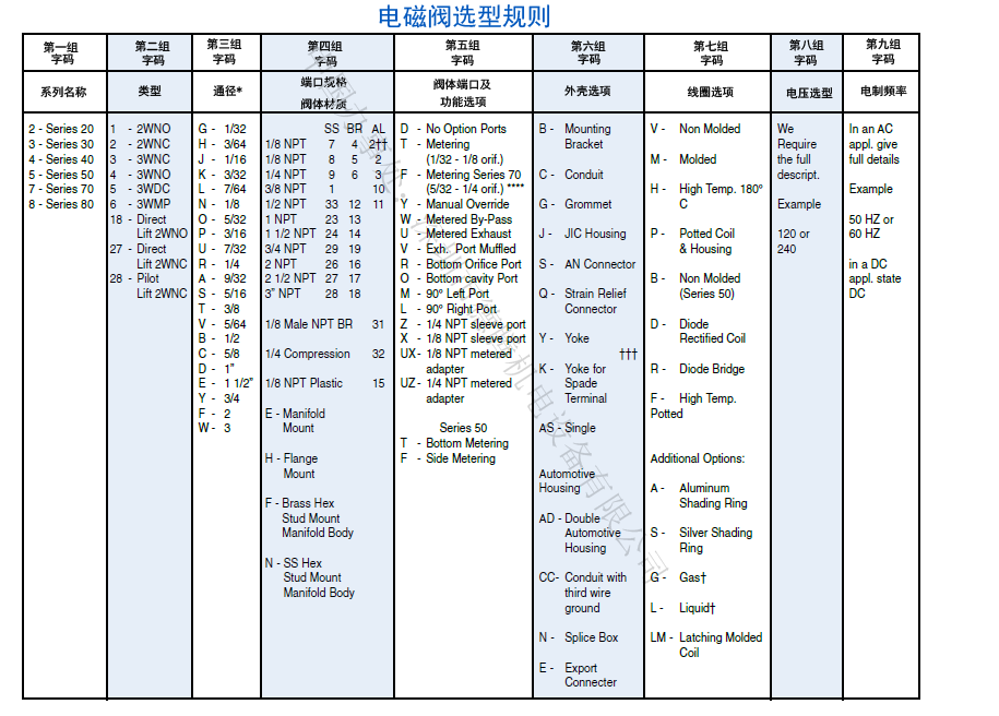 阀体材质: 不锈钢. 内部材质: 不锈钢. 密封材质: 丁晴橡胶 (Buna) (标配). 可选:FKM、PTFE、EPDM、FFKM等.* 密封柱塞: Kel-F (标配.), Delrin, Teflon, Nylon, PEEK, Radel, Ultem, 303 不锈钢(选配.) 通径规格: 见上列表. 接口规格: 1/8″或1/4" NPT 外壳类型: 隔爆型--管道引线外壳1/2″ NPT 管道螺纹. 安装: 必须垂直在30°以内安装. 安全认证: 该系列电磁阀都经过UL 和 CSA的防爆安全认证,等级: Class I, Div 1, Group C and D – Class II, Div 1, Group E, F, and G; Div 2, Groups C, D, E, F, and G. 使用寿命: 大于500万次,取决于应用程序、维护保养等因素. 阀体重量: 600 g. 维修包: 见上列表. 选配说明: 可选配的项包括:压力、介质、电压、接口规格、材质、温度、防爆等*.