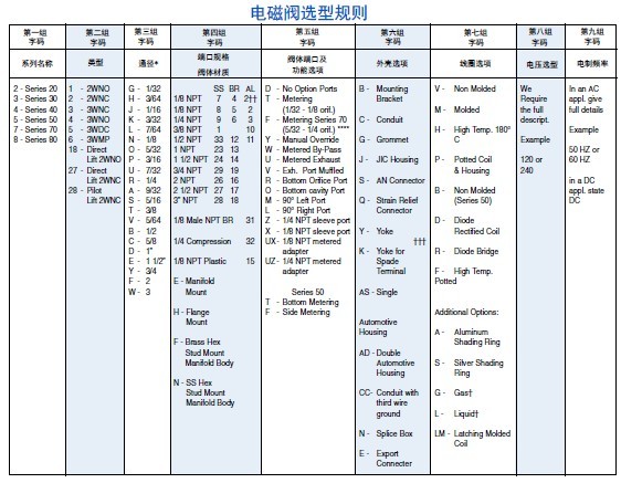 阀体材质: 不锈钢(标配),可选配:黄铜 内部材质: 不锈钢. 密封材质:丁晴橡胶 (Buna) (标配). 可选:FKM、PTFE、EPDM、FFKM等.* 通径规格: 见上列表. 接口规格: 1/8″ NPT (标配.) 外壳类型: 封装线圈用1/2″ NPT 管道引线. 安全认证: 经过 UL 和 CSA防爆安全认证,防爆等级— Class I, Div 1, Groups A, B, C, and D – Class II, Div 1, Groups E, F, and G; Div 2, Groups A, B, C, D, E, F, and G. “T” 我们可以做到T5. 使用寿命: 大于500万次,取决于应用程序、维护保养等因素. 阀体重量: 273 g. 维修包: 见上列表. 选配说明:可选配的项包括:压力、介质、电压、接口规格、材质、温度、防爆等*.